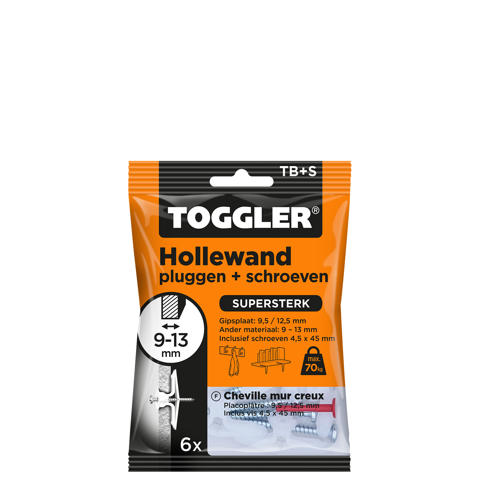 De Toggler Hollewandplug TB gebruik je voor het bevestigen van voorwerpen in holle wanden en plaatmateriaal, zoals gipsplaat van 9,5 tot 12,5 mm dik. Monteer de plug snel en makkelijk met behulp van de bijgeleverde rode pin. Het grote draagvlak achter de plaat zorgt voor een sterke houvast. De plug past altijd als de ruimte achter de wand minimaal 17 mm is. Door de grote anti-rotatie vleugels draait de plug niet mee wanneer je er een schroef indraait.