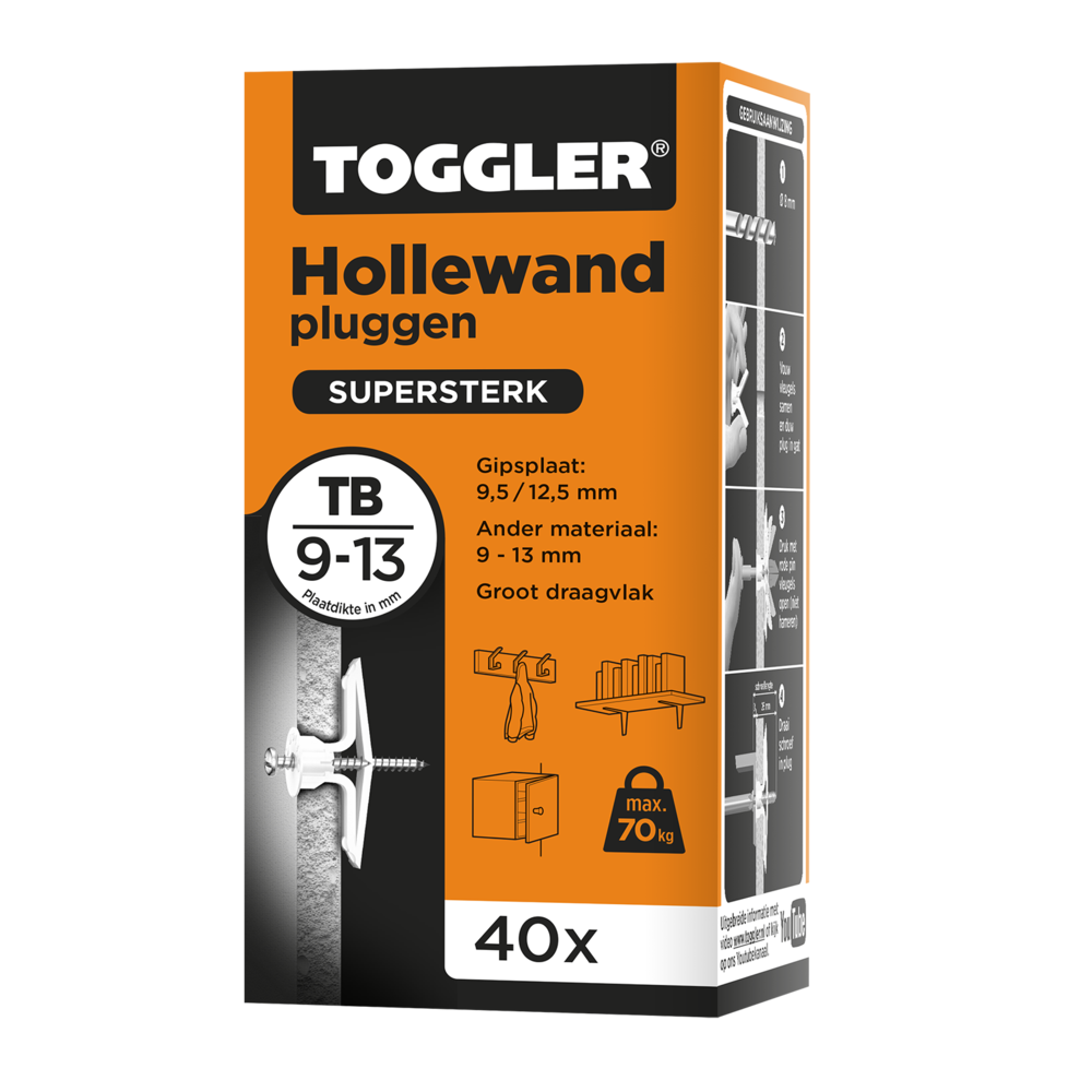 De Toggler Hollewandplug TB gebruik je voor het bevestigen van voorwerpen in holle wanden en plaatmateriaal, zoals gipsplaat van 9,5 tot 12,5 mm dik. Monteer de plug snel en makkelijk met behulp van de bijgeleverde rode pin. Het grote draagvlak achter de plaat zorgt voor een sterke houvast. De plug past altijd als de ruimte achter de wand minimaal 17 mm is. Door de grote anti-rotatie vleugels draait de plug niet mee wanneer je er een schroef indraait.