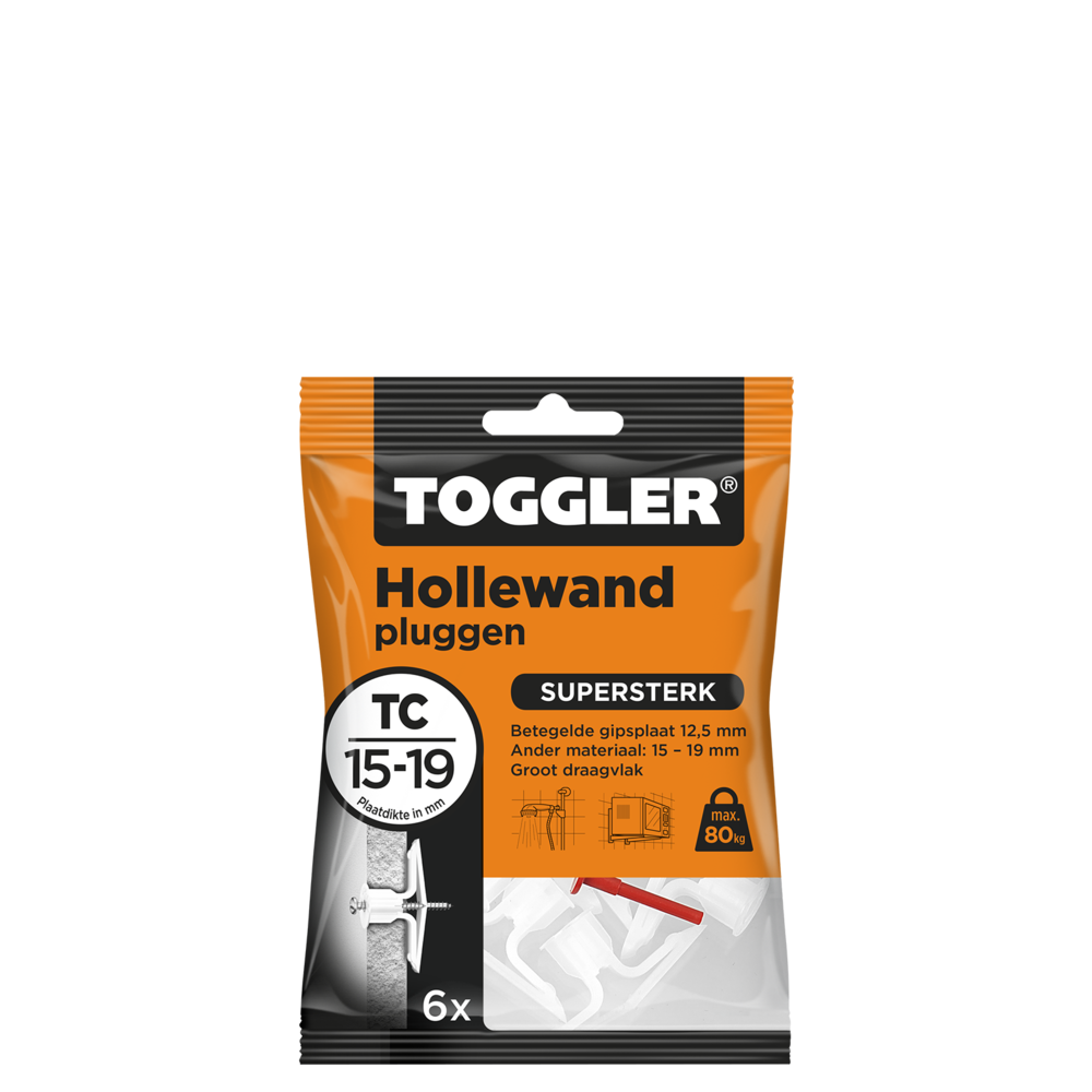 De Toggler Hollewandplug TC gebruik je voor het bevestigen van voorwerpen in holle wanden en plaatmateriaal, zoals gipsplaat van 15 mm of gipsplaat van 12,5 mm met tegel. Monteer de plug snel en makkelijk met behulp van de bijgeleverde rode pin. Het grote draagvlak achter de plaat zorgt voor een sterke houvast. De plug past altijd als de ruimte achter de wand minimaal 17 mm is. Door de grote anti-rotatievleugels draait de plug niet mee wanneer je er een schroef indraait.