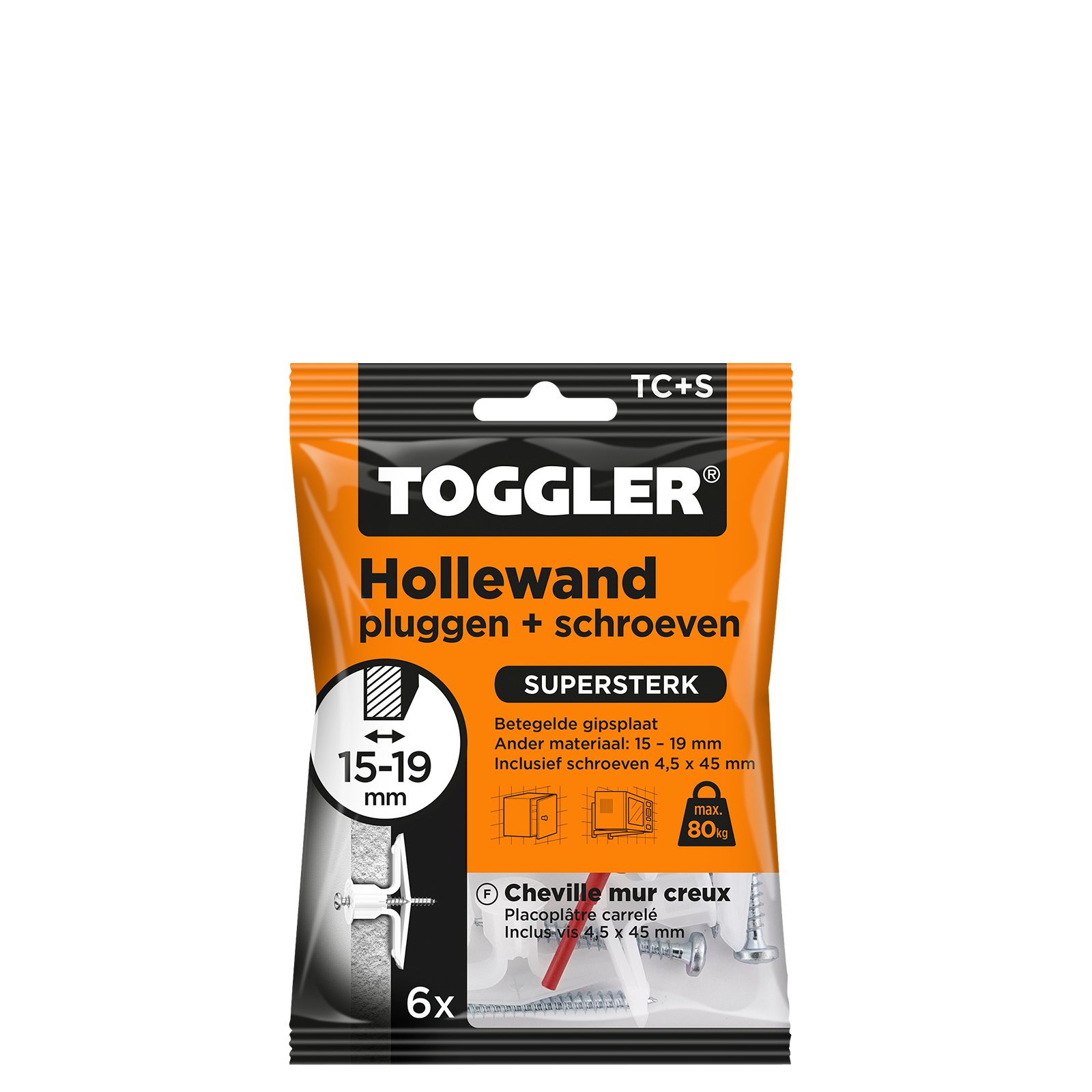 De Toggler Hollewandplug TC gebruik je voor het bevestigen van voorwerpen in holle wanden en plaatmateriaal, zoals gipsplaat van 15 mm of gipsplaat van 12,5 mm met tegel. Monteer de plug snel en makkelijk met behulp van de bijgeleverde rode pin. Het grote draagvlak achter de plaat zorgt voor een sterke houvast. De plug past altijd als de ruimte achter de wand minimaal 17 mm is. Door de grote anti-rotatievleugels draait de plug niet mee wanneer je er een schroef indraait.