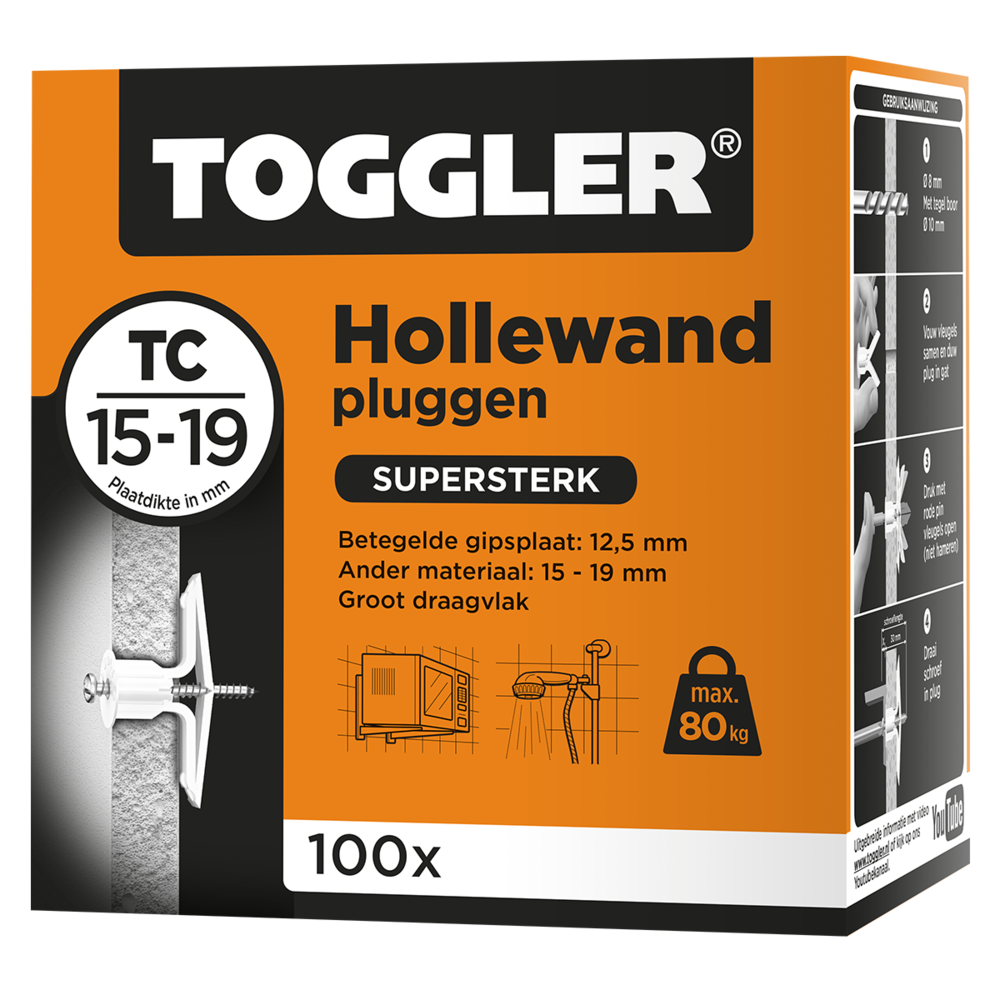 De Toggler Hollewandplug TC gebruik je voor het bevestigen van voorwerpen in holle wanden en plaatmateriaal, zoals gipsplaat van 15 mm of gipsplaat van 12,5 mm met tegel. Monteer de plug snel en makkelijk met behulp van de bijgeleverde rode pin. Het grote draagvlak achter de plaat zorgt voor een sterke houvast. De plug past altijd als de ruimte achter de wand minimaal 17 mm is. Door de grote anti-rotatievleugels draait de plug niet mee wanneer je er een schroef indraait.