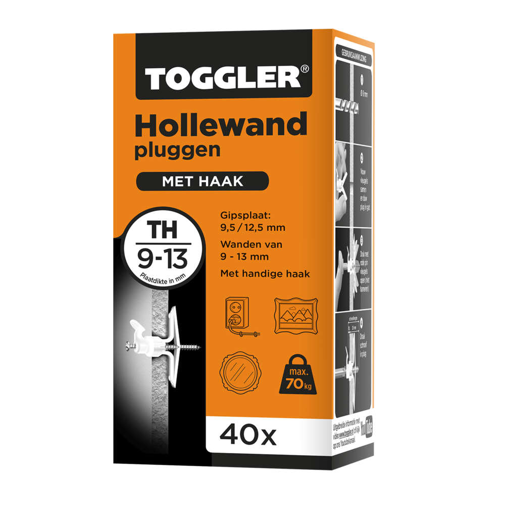 De Toggler Hollewandplug TH gebruik je voor het bevestigen van voorwerpen in holle wanden en plaatmateriaal, zoals gipsplaat van 9,5 tot 12,5 mm dik. Monteer de plug snel en makkelijk met behulp van de bijgeleverde rode pin. Het grote draagvlak achter de plaat zorgt voor een sterke houvast. De plug past altijd als de ruimte achter de wand minimaal 17 mm is. Door de grote anti-rotatievleugels draait de plug niet mee wanneer je er een schroef indraait.